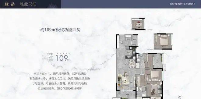 建面109平四房,户型方正,比较中规中矩,U型厨房,可容纳多人备餐,还带独立主套。