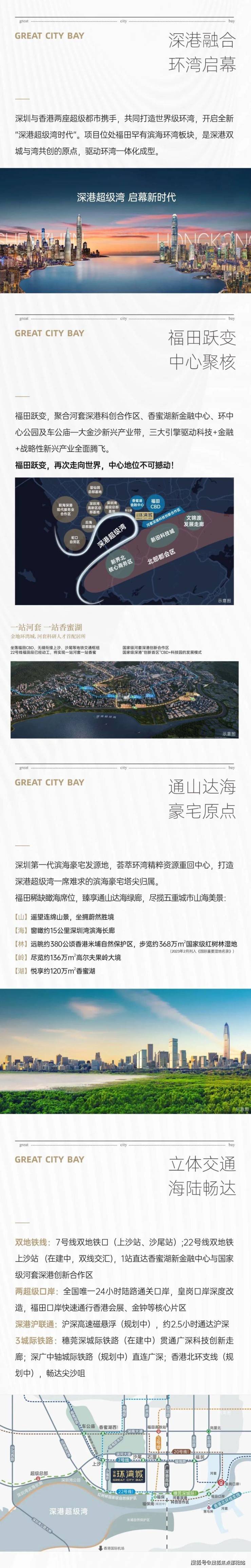 ·双地铁线:7号线双地铁口优势;22号线双地铁上沙交汇站(规划中),1站直达香蜜湖新金融中心与河套深港创新合作区。·超级口岸:皇岗口岸深度改造,深港唯一24小时陆路通关口岸,3城轨+2地铁,迅捷连通深港河套两地。·联港通沪:沪深高速磁悬浮规划,约2.5h通达沪深,链接“上广深港”南中国超级都会群。·城际轨道:全面覆盖广深科技创新走廊的穗莞深城际铁路,贯通大湾区重要科技核芯;深广中轴城际铁路,直连广深城市中心;香港北环支线,再添深港连通新轨道,便利畅达尖沙咀。