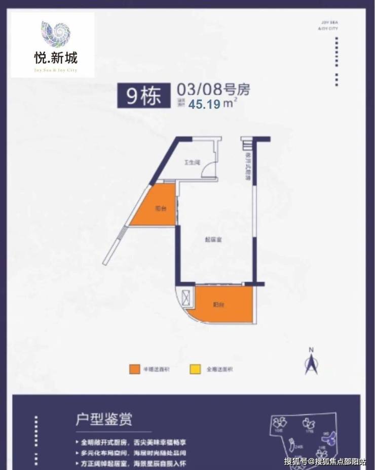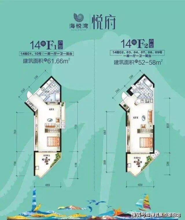 建筑面积:F1:约61.66㎡ F2:约52~58㎡,近南北向通透布局,避风采光俱佳,大阳台休闲景观,仅计一半面积,滨海度假公寓,舒适悦享,尽揽无上风景