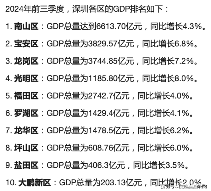 根据深圳市地区生产总值统一核算结果,2024年前三季度,宝安区地区生产总值为3829.57亿元,同比增长6.8%,总量排名全市第二,仅次于南山。