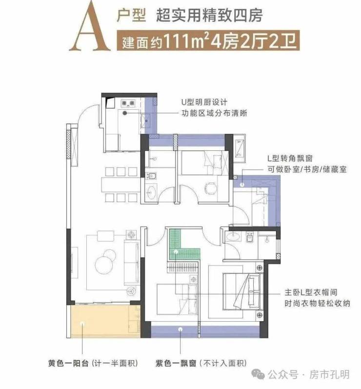 建面111㎡4房2厅2卫A户型:四房设计实用性强,动静分区明确,餐客厅一体,阳台开间宽敞。主卧套房设计,带卫生间和衣帽间,居住舒适度高。