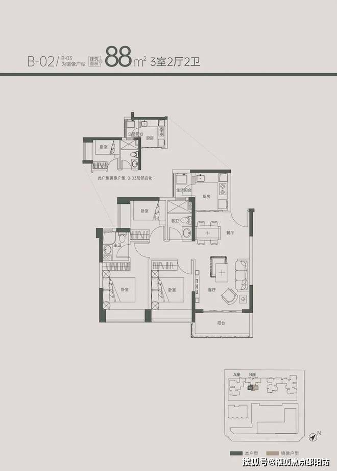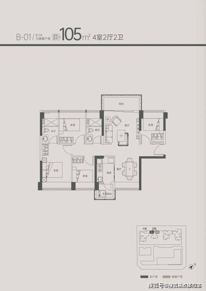 南北通透四房户型,是「京地海樾府」最大的户型,主阳台朝西北,生活阳台朝东南。同样位于1B座的2梯4户结构,这个户型只有58套,适合改善需求和周边本地人置业。