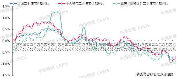 图:2020年7月至2024年5月百城、十大城市及重庆二手住宅价格环比走势对比数据来源:中指数据CREIS(点击查看)市场监测:https://www.cih-index.com/
