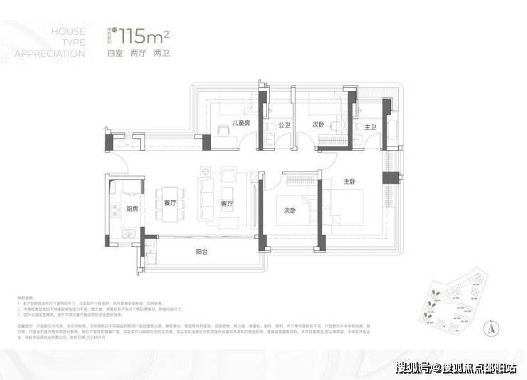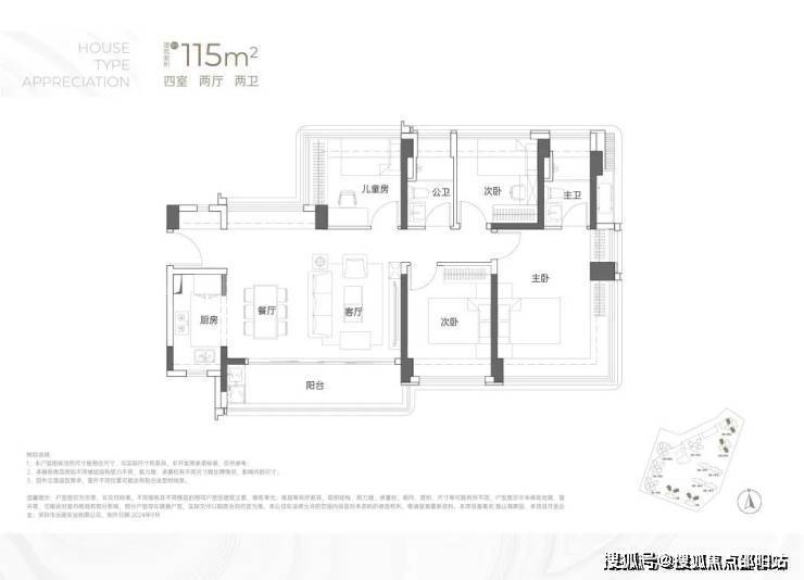 115㎡的4房2厅2卫户型分布于1/2栋,东南、西南朝向,横厅户型但是能做到南北通,赠送率最高的户型,2栋1单元户型差异这在阳台位置的设置上;