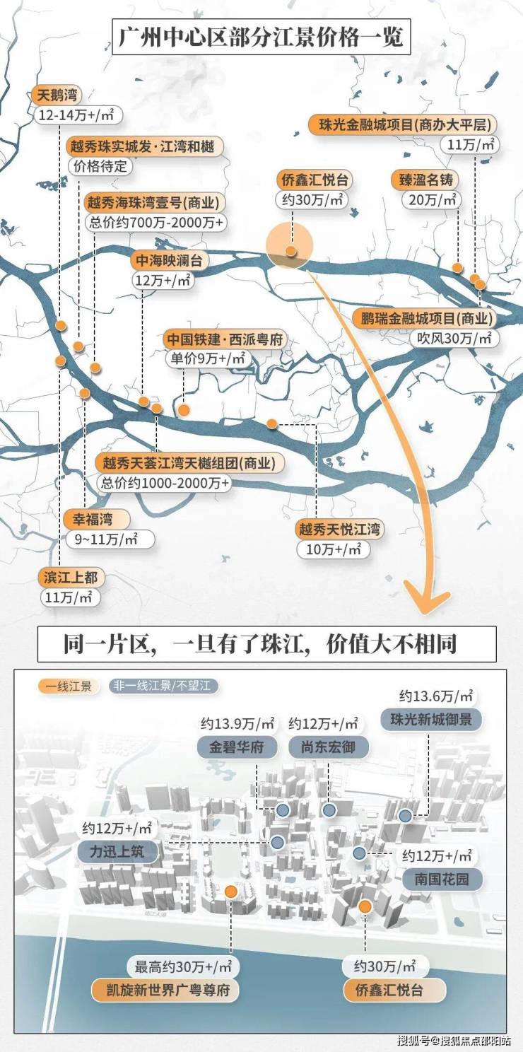 纵观珠江两岸的豪宅,每一个项目都拿“江景”做文章,从初代富人区滨江东,到二沙岛,再到珠江新城,再到新贵琶洲、创新湾,无一不是有江景加持的。