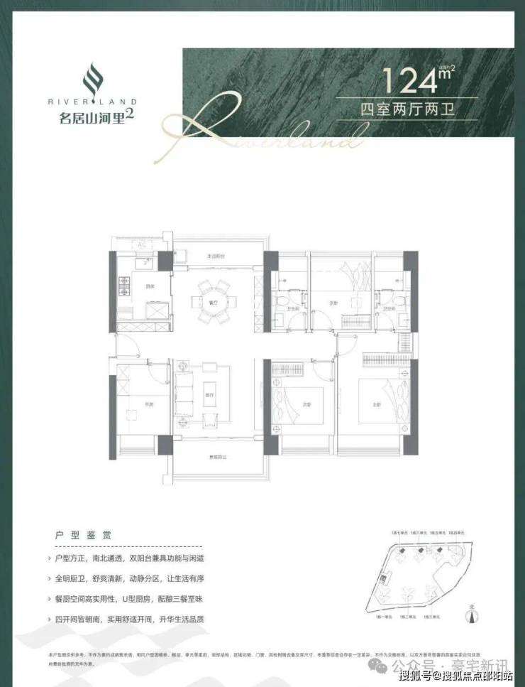 经典竖厅南北通格局,双阳台设计,其中,124㎡是142㎡的缩小版,餐客厅独立,客厅开间(124㎡为3.9m,142㎡为4.3m),U型厨房,卫生间干湿分离,四开间朝南,阳台1.5m进深,东南向