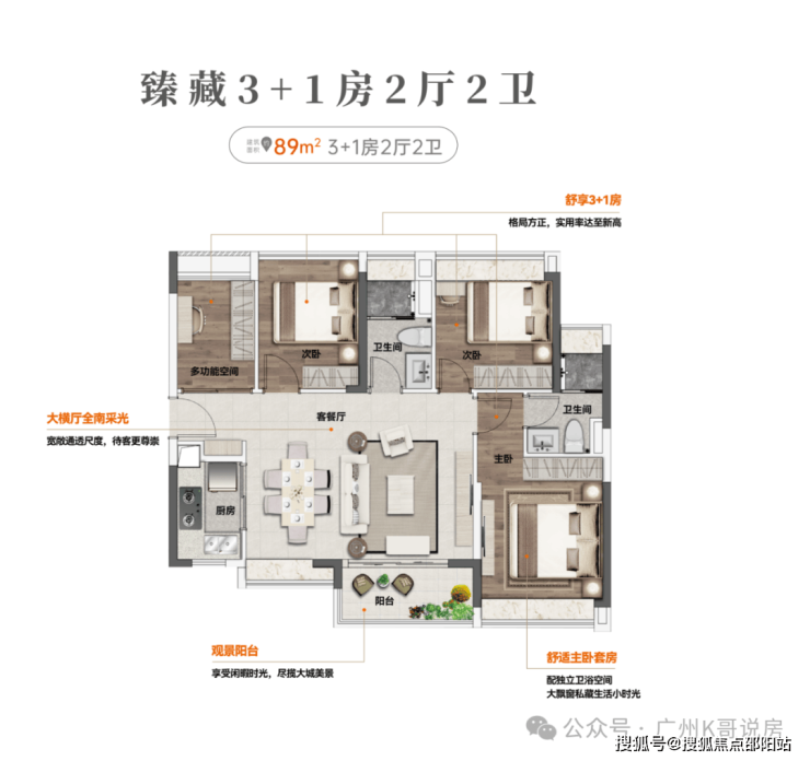 独立单边位,南北对流,大横厅南向采光、通风、观景