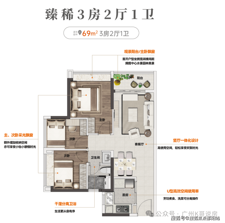 主、次卧采光飘窗,干湿分离卫浴,U型厨房