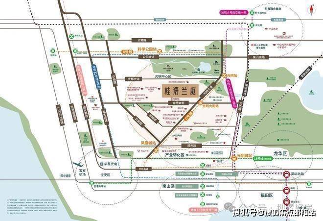 光明中心区定位是光明科学城的生活服务中心,以约208万方科学公园为核心,规划成片高端住宅区及商业、市政配套于一体的高复合城市综合体,构造深圳北部中心的“城市心脏”,汇聚科学展馆、国际会议中心、交通枢纽和休闲中心等多元功能。