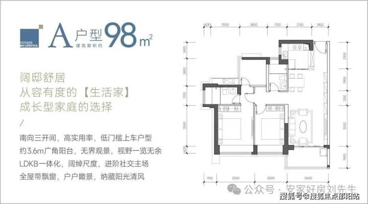 98㎡的3房2厅2卫,设计的是经典竖厅格局,LDKB一体化设计,客厅3.6米开间,三开间朝南,动静分区,3个卧室分别做到了主卧13.69㎡/次卧11.62㎡/次卧5.76㎡(包含墙体飘窗),都不用搭配飘窗做床,L型厨房,卫生间干湿分离,得房率约:89%(包含赠送),西南、东南或正南朝向。