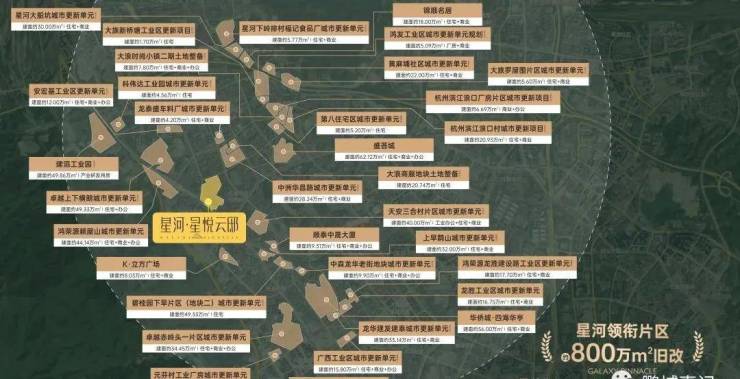 "星河领衔旧改,品牌开发商齐聚,更新片区超800万㎡。星河、华润、鸿荣源、华侨城、卓越等一线品牌发展商聚集,旧改旗舰环绕,享受城市更新头排利好,城市未来迭新。"