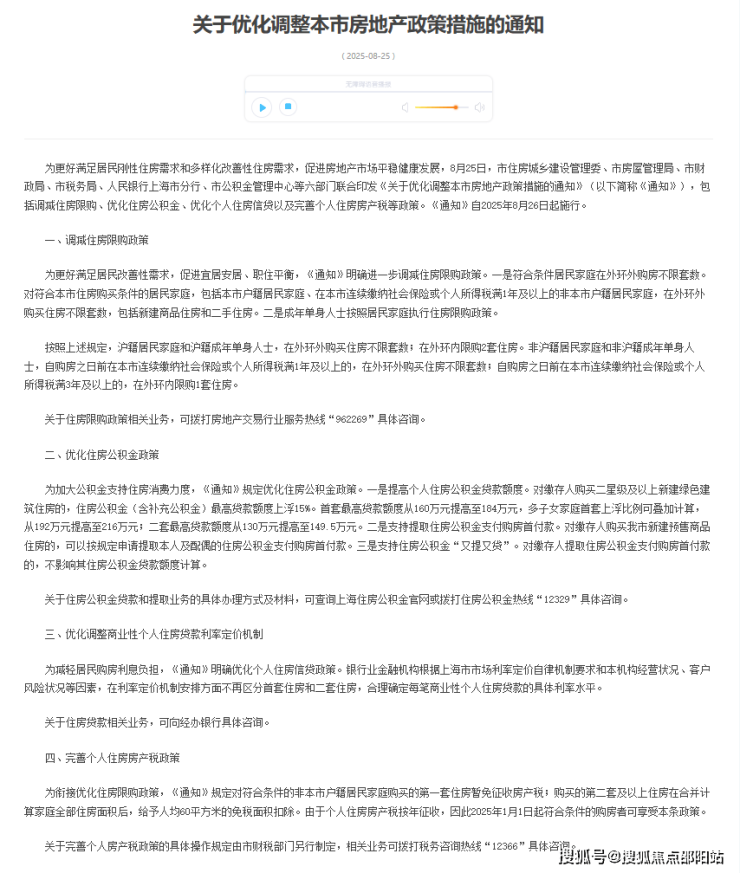 2025年8月25日,上海市住房城乡建设管理委、市房屋管理局、市财政局、市税务局、人民银行上海市分行、市公积金管理中心等六部门联合印发《关于优化调整本市房地产政策措施的通知》,从进一步优化住房限购政策、加大公积金贷款支持力度、完善个人住房房产税等方面出台政策措施。