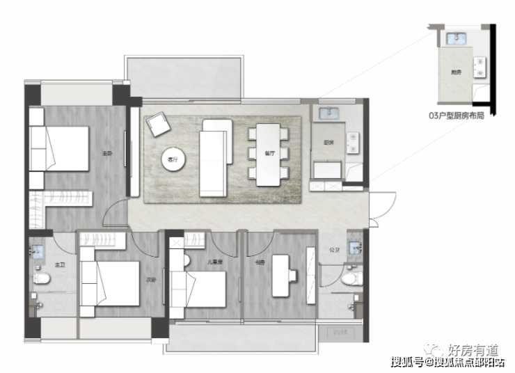 B户型(约124㎡四房两厅两卫)· 方正全明四房,美好生活一步到位· 客餐厨一体化设计,品自在人生格局· 独立入户前室,畅享尊崇与私密感· 阔绰通透布局,容纳更多清风阳光· 270°MAX瞰景阳台,尽揽湖山风光· 卧室连通观景阳台,私享更多美景