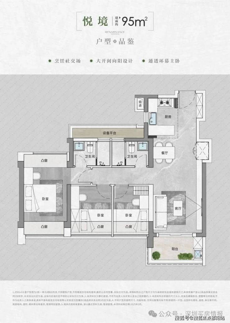 • 得房率:通过创新性的飘窗、双阳台改造、设备平台赠送等设计,实现平均94-96%的惊人得房率。