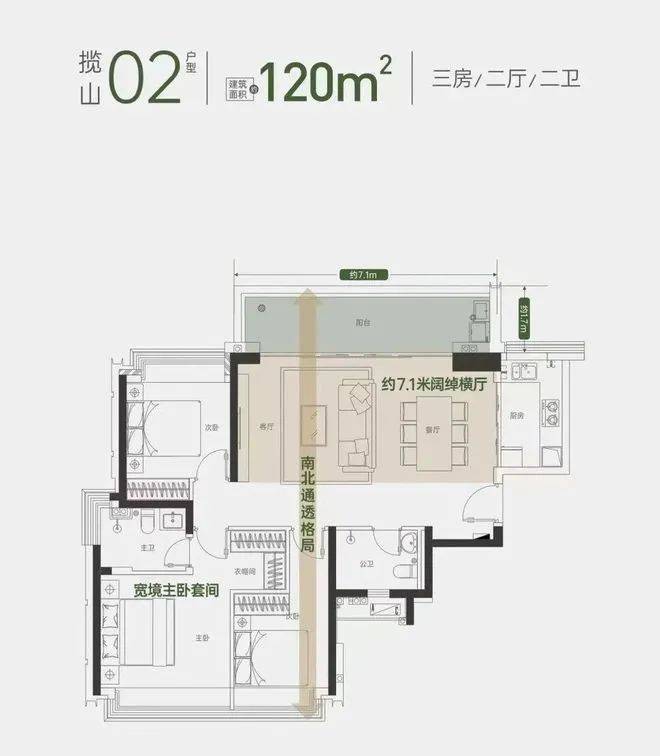 120㎡横厅户型看山,竖厅户型更靠近北环大道。横厅户型每一层有两个房源,客厅阳台和一个次卧朝东北,主卧、另一次卧及卫生间朝西南,客餐厨一体化+大阳台,视野上更加开阔。主卧借走隔壁次卧的一部分空间做成一个衣帽间。整体上动静分离,户型方正,视野开阔。