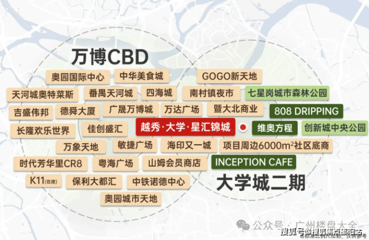商业配套:越秀大学星汇锦城自身规划配建了底商和商业街,但是目前周边配套和城市界面比较一般,大型的商业体要去到万博商圈。