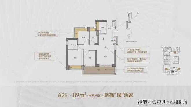 竖厅格局,客厅3.5米开间,LDKB一体化,S墙设计预留冰箱卡槽位,客厅连接次卧出5.9米长的大阳台,主卧双面飘窗,次卧270°转角飘窗,全屋6面飘窗,U型厨房,卫生间干湿分离。