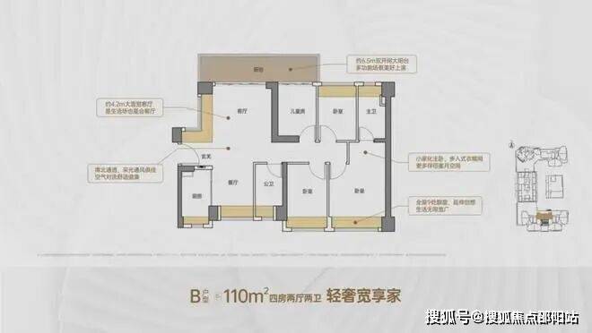 进门户玄关,客厅4.2米开间,客厅连接次卧出6.5米长的大阳台,主卧大套间设计,全屋9处飘窗,U型厨房,卫生间干湿分离。