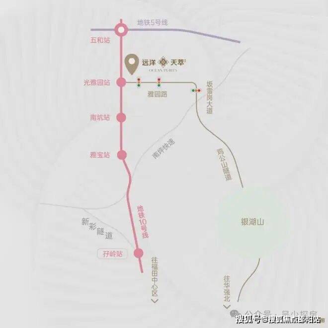 远洋天萃家门口就是“福田专线”——10号地铁线“光雅园站”B出口,1站到五和枢纽站,可换乘5号地铁线/深大城际,3站可到龙华深圳北站,3站到福田、4站到南山。