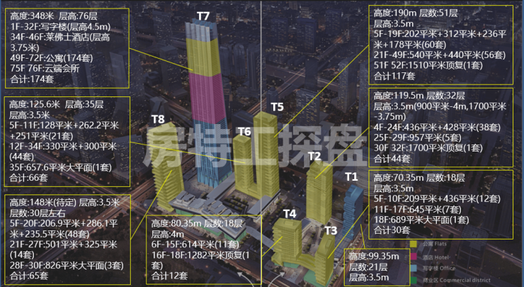 深圳湾一号总建筑面积47.5万㎡,由8座塔楼及1座商业建筑组成,分为南北两区,北区分为:T1写字楼、T2、T3、T4公寓;南区分为:T5、T6、T8公寓,T7为环球商务中心。