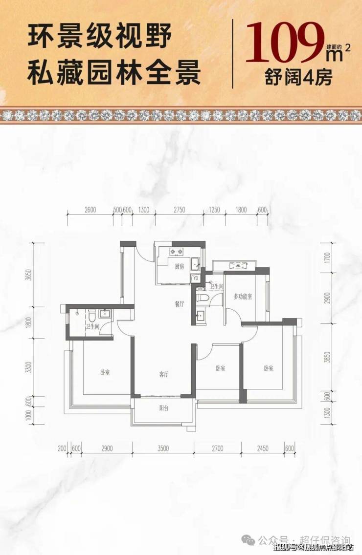 户型面积布局109平四房两厅两卫设计的是竖厅双龙抱珠格局,进门入户玄关,客厅3.5米开间,LDKB一体化,主卧270°无柱转角飘窗,分别做到了主卧15.45㎡/次卧13.57㎡/次卧9.31㎡/次卧6.96m²(包含墙体飘窗),U型厨房,公卫三段式干湿分离,得房率约74%(不含赠送),阳台西南朝向约5.95平。套内面积80.81㎡+赠送面积16.75㎡=实得面积97.56㎡,加上赠送后得房率约89.34%。户型亮点整个珈誉大城约8000套房中唯一的44套,首发即绝版,双龙抱珠,端头位独门独户,享玖玺最长景观视距。