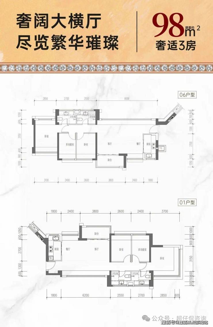 户型面积布局98平三房两厅两卫设计的是横厅南北通透格局,进门入户玄关,客餐厅6.2米开间,LDKB一体化,分别做到了主卧15.27㎡/次卧8.58㎡/次卧7.92㎡(包含墙体飘窗),L型厨房,卫生间干湿分离,得房率约74%(不含赠送),阳台主朝东南或西北向约6.27平。套内面积72.62㎡+赠送面积19.48㎡=实得面积92.1㎡,加上赠送后得房率约93.85%。户型亮点06户型是整个珈誉大城约8000套房中唯一的44套,首发即绝版,超强双面采光,客餐厅约8米超长飘窗,6开间全朝南看园林全景,高区可看湾区海景、凤凰山景、立新湖景。
