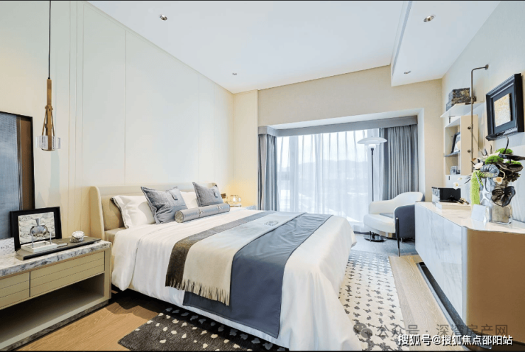 主卧空间尺度奢阔,南北通透,具有超宽开间3.7m,同时设计了全落地YKK系统门窗的凸窗,每日起床均可享有自然阳光。