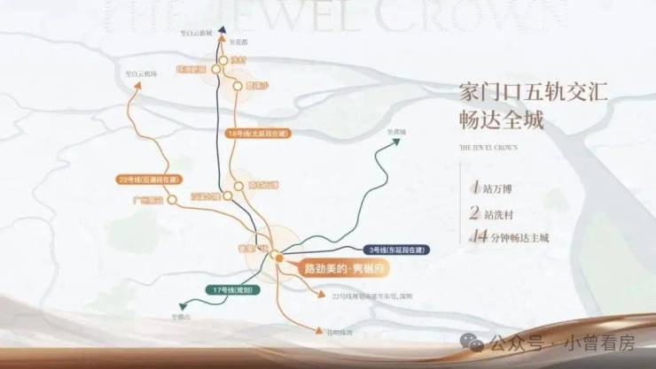 五轨交汇,家门口地铁3号线/18号线/22号限/17号线(在建)/3号线东延线(在建),1站万博、2站珠江新城,直通南沙、联动广/佛/莞的核芯节点,畅享湾区1小时生活圈。
