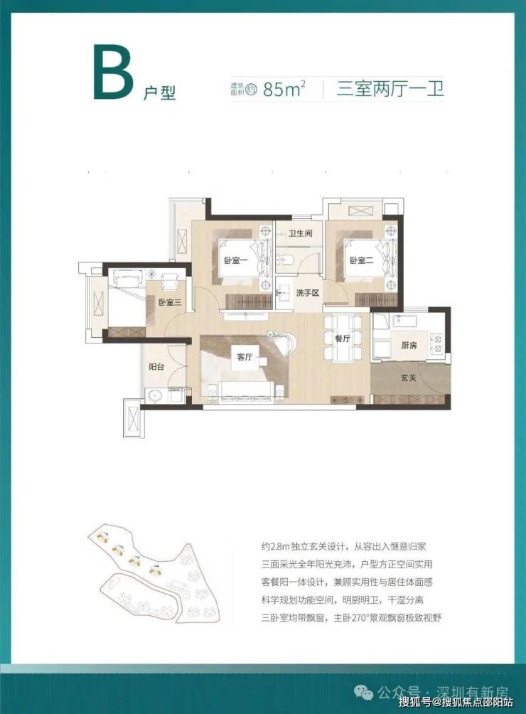85㎡的3房2厅1卫,设计的是竖厅格局,餐客厅一体化设计,U型厨房,卫生间三段式分离设计,得房率:79.26%(不含赠送),阳台朝西南或东南向。
