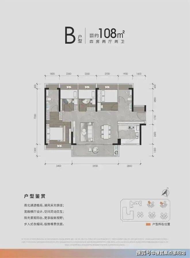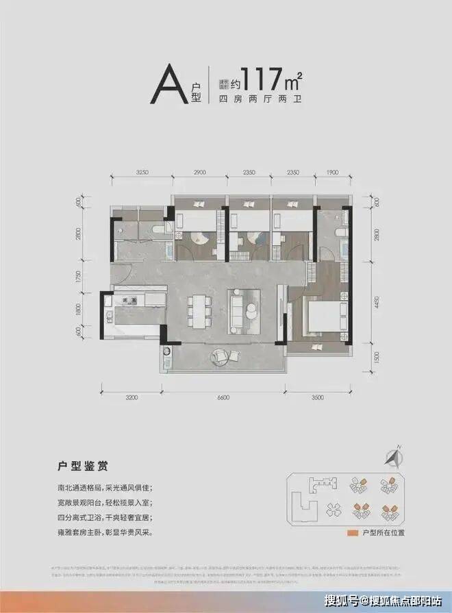 :横厅布局,客厅开间5.9-6.6米,南北通透,主卧套房设计;