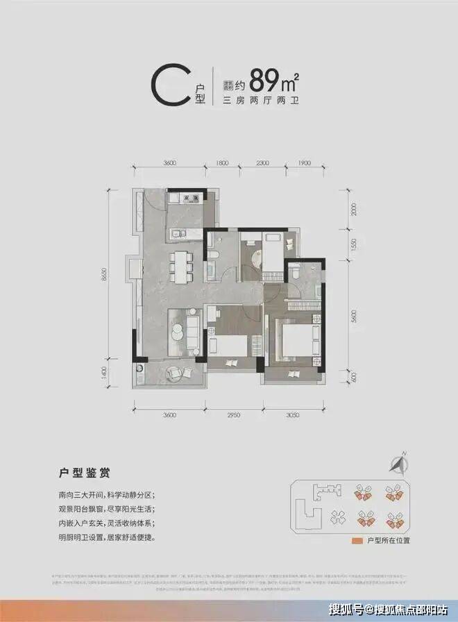 :竖厅设计,动静分区,主卧开间3.05米,西南/东南朝向;