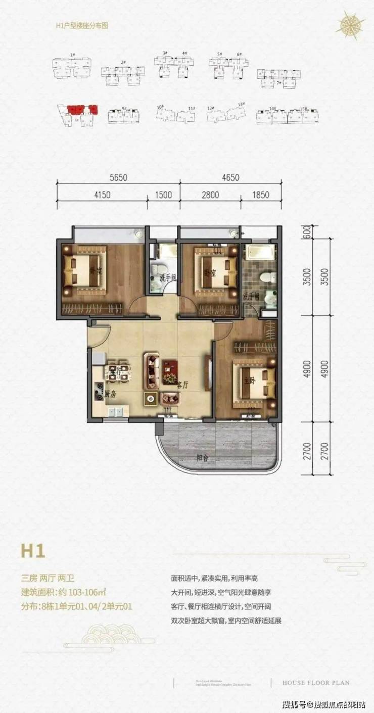 一单元两梯4户,二单元2梯3户,13层高,三房两厅两卫,超大2.4-2.75m阳台开间,双户型全朝南设计。