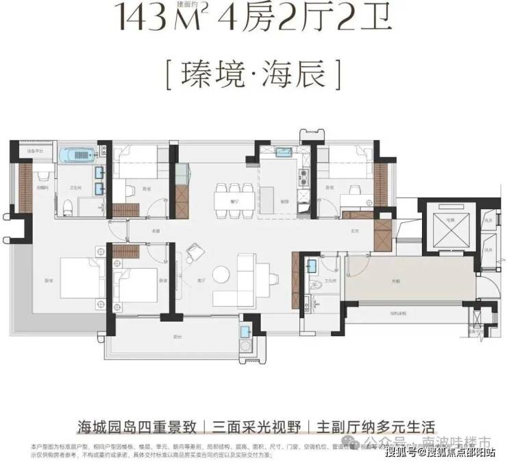主力户型: 面积从114㎡到143㎡不等,纯四房设计