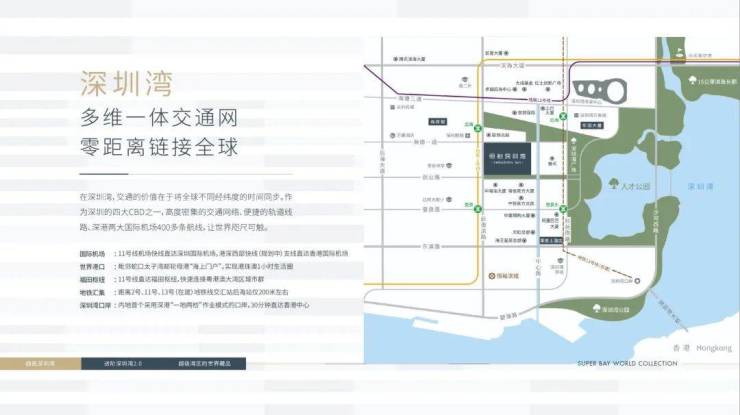 项目处在深圳湾后海金融区中轴之地,片区进驻总部企业约82家,包含约22家世界500强;项目200米范围内汇集了2、11、13号线(在建中)三条地铁线,更有“四横二纵”多维交通线路,零距离链接全球。