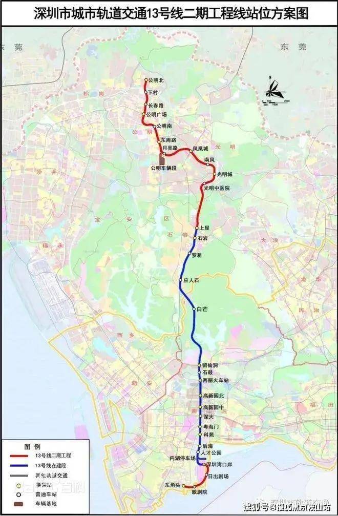 ①13号线及其南、北延长线(建设中,预计2025年开通)起于东角头站,终于公明北站,纵贯光明、宝安、南山,线路开通后约30分钟可抵达南山核心区,约45分钟可达深圳湾口岸,以高新技术人才为主要客流,被称为高新技术人才专线