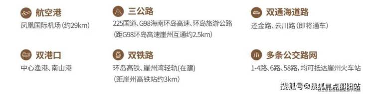 【轨道】距离崖州动车站约3.6公里,崖州动车站至三亚凤凰机场9分钟,至三亚火车站14分钟。城际轨道交通已建成,待投入使用(三亚至乐东方向,5分钟/班,直达机场、连接动车站)