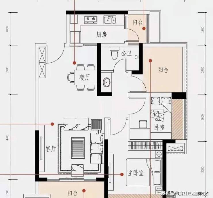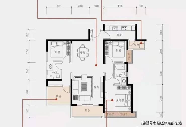 A户型:约117㎡ 4房2厅2卫 亮点:餐客厅双阳台 奢阔主卧