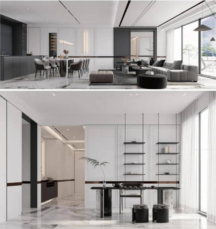 约130㎡多厅双厨奢华会客空间,轩朗阔绰大格局,彰显居者尊崇品味。约9m超大面宽客餐厅,匠造一方尊崇礼客之所。