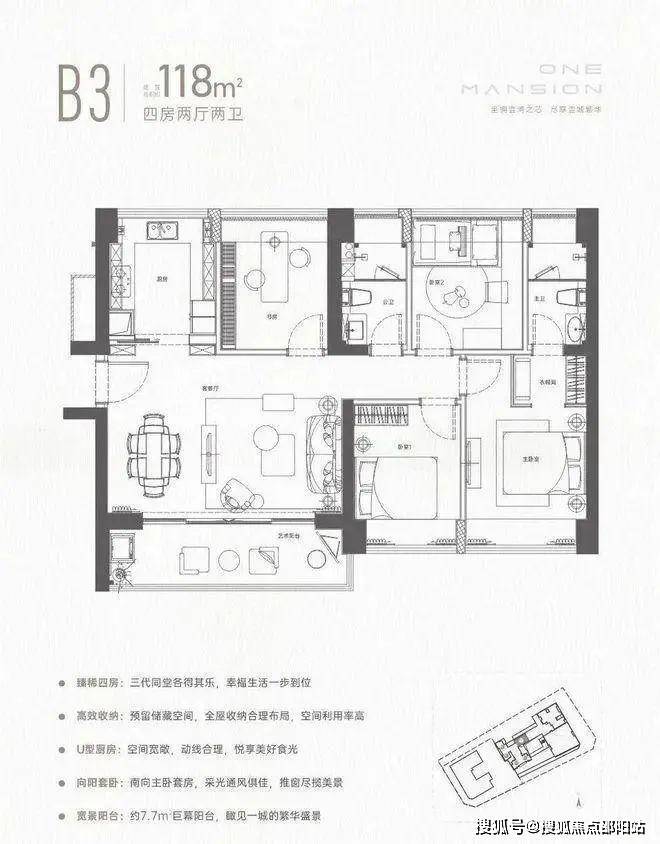 118㎡的4房2厅2卫,设计的横厅南北通透格局,全屋飘窗设计,三开间朝南,U型厨房,约7.7米长超大阳台,得房率72.47%(不含赠送),阳台主朝东南朝向。