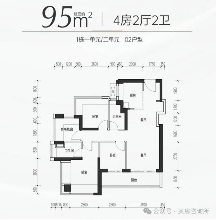 95㎡的4房2厅2卫,设计的是竖厅格局,进门独立玄关,LDKB一体化,S墙设计预留冰箱卡槽位,主卧双飘窗设计,客厅连接次卧出6米长的大阳台,L型厨房,卫生间干湿分离,得房率约97%(包含赠送),西南朝向。