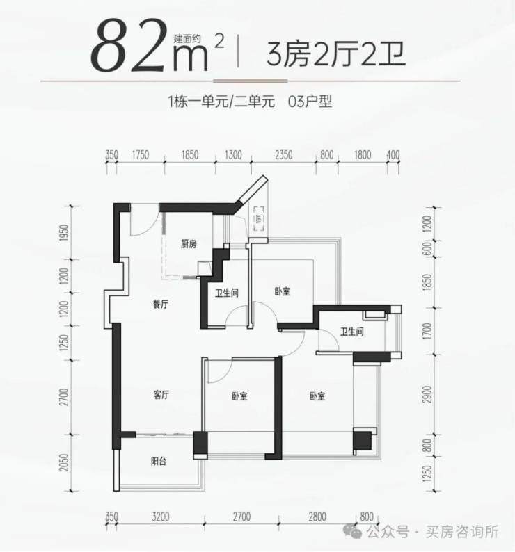 82㎡的3房2厅2卫,03户型,设计的是竖厅格局,进门独立玄关,LDKB一体化,S墙设计预留冰箱卡槽位,主卧双飘窗设计,L型厨房,卫生间干湿分离,得房率约100%(包含赠送),西南朝向。