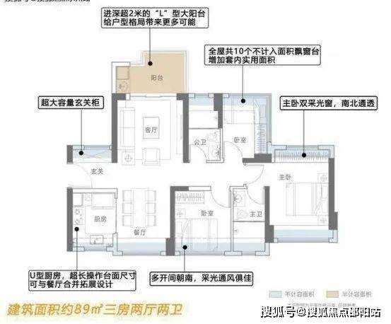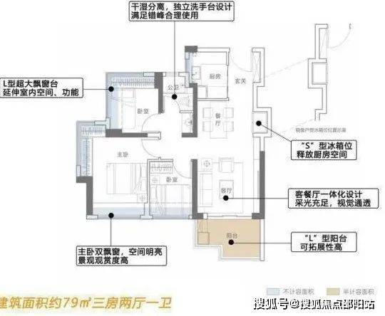 ●配备局部进深达2.1米、约6.2㎡的L型大阳台;