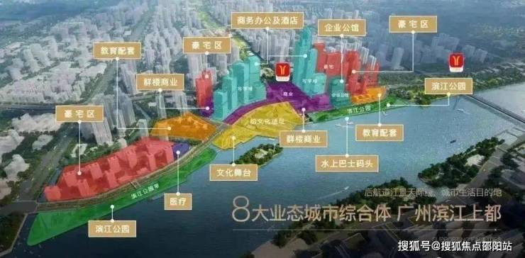 8大业态城市综合体,规划有大型商业,企业总部,星级酒店,滨江公园,文化艺术中心,教育医疗配套,高端居住及TOD立体交通于一体,广州唯一最全配套大体量的综合体。