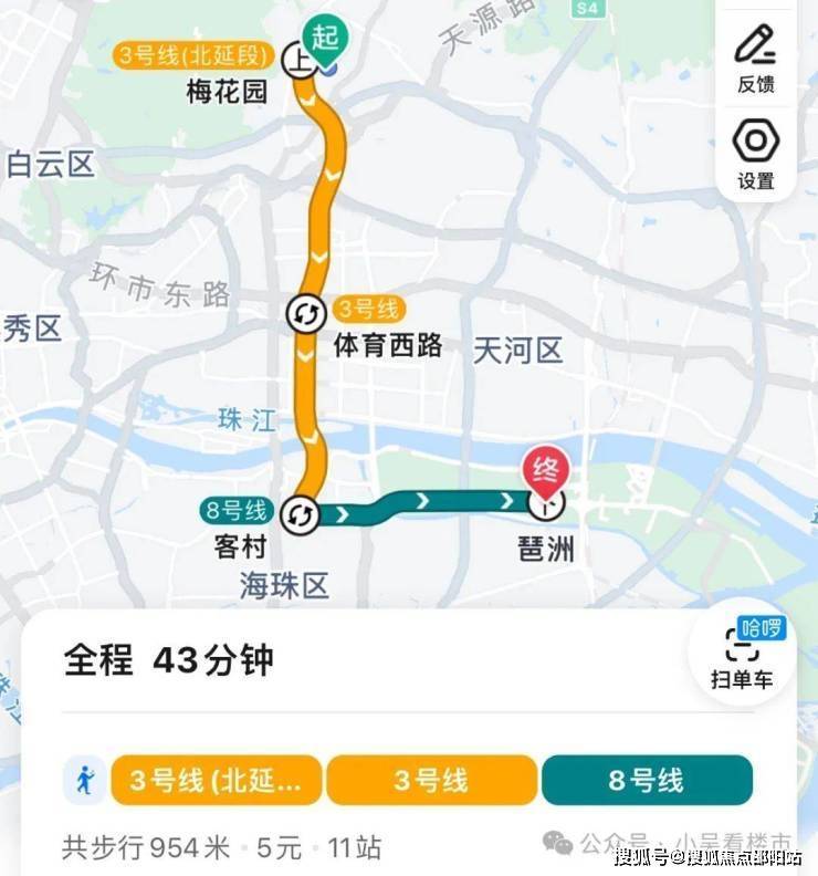 地铁去往琶洲:步行至梅花园站,乘坐3号线到客村换乘8号线,再到琶洲,总共11个站,耗时43分钟左右。