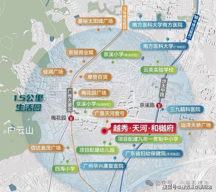 项目位于天河北梅花园板块,距离珠江新城直线距离仅5公里,这里可一路串联广州大道北、天河北、珠江新城等商圈,小区距离地铁3号线梅花园站步行约800米,附近还有在建设的18号线北延段京溪路站,小区旁还配建了幼儿园以及九年制学校,由华阳小学+广州中学管理,预计明年9月份就能开学。