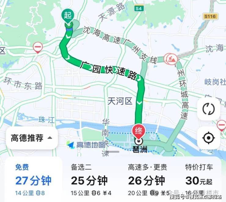 自驾去琶洲:出小区燕园路转至沙太南路,再走广园快速至科韵路,全程14公里,耗时27分钟左右。