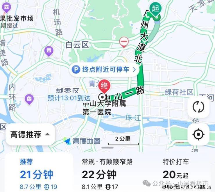 自驾去越秀中山医:出来小区上怡新路转至广州大道,再转中山一路,全程8.7公里,耗时21分钟左右。