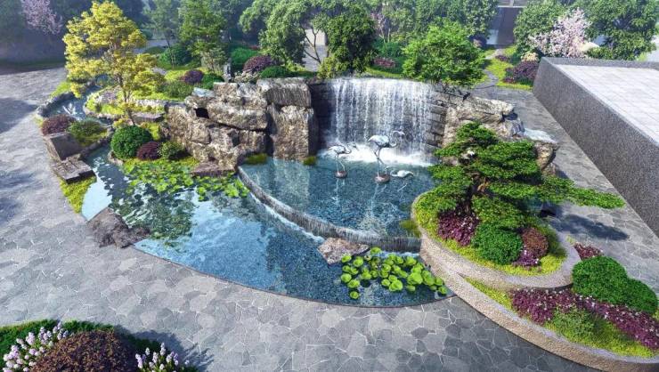 四重水景:提取凤凰山的形态纹理将自然山林元素与现代都市生活有机结合,在有限的面积之中,还原无限的自然山水之趣。
