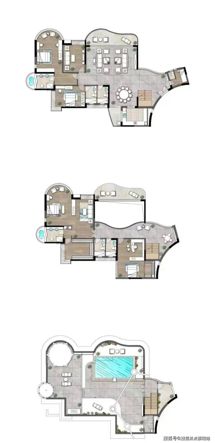 再细看,约458平、467平、564平顶复户型图参考如下,为双层结构,且赠送多一层露天泳池花园,相当于有3层使用空间。