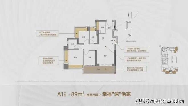 竖厅格局,客厅3.5米开间,LDKB一体化,S墙设计预留冰箱卡槽位,客厅连接次卧出5.9米长的大阳台,次卧270°转角飘窗,对比A1户型少一面飘窗,U型厨房,卫生间干湿分离。